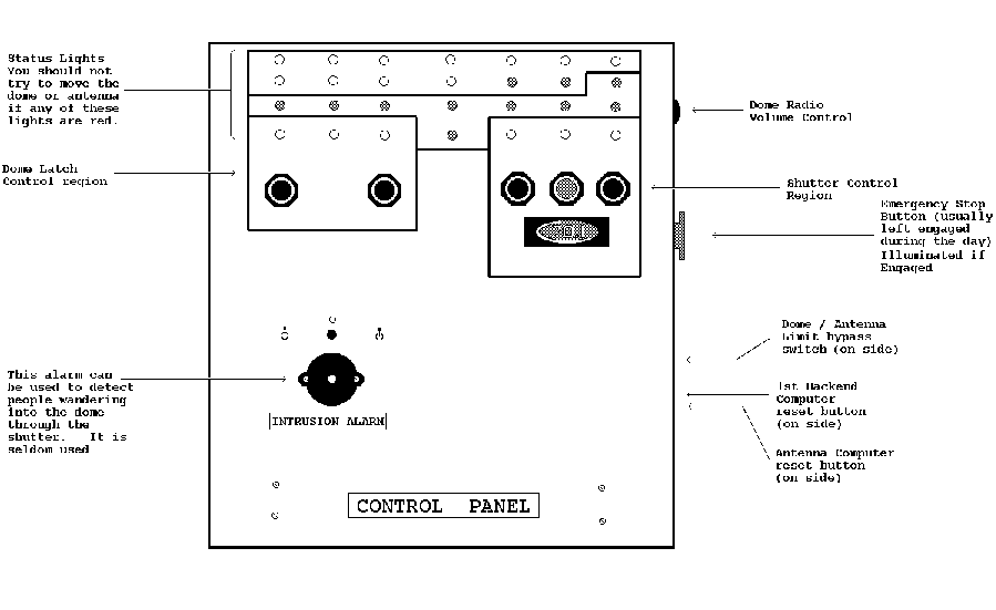 This is the Control Panel, which lives in the Control Room. Under normal conditions, observers only use this panel to raise and lower the shutter, and to enable/disable all motion via the big red Stop Button. But you wouldn't be reading our manual if you were content with such pedestrian functions. The red arrwos point out some features: