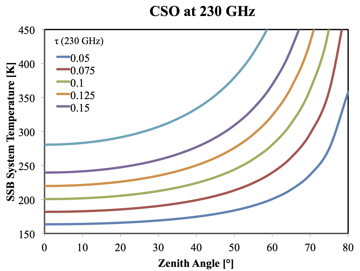 For the above parameters and TRx = 40 K [DSB], the approximate SSB system temperature at 230 GHz is: