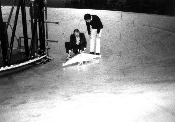 Caltech Professors Robert Leighton and Tom Phillips measuring panel curvature. (Photo circa 1981.)